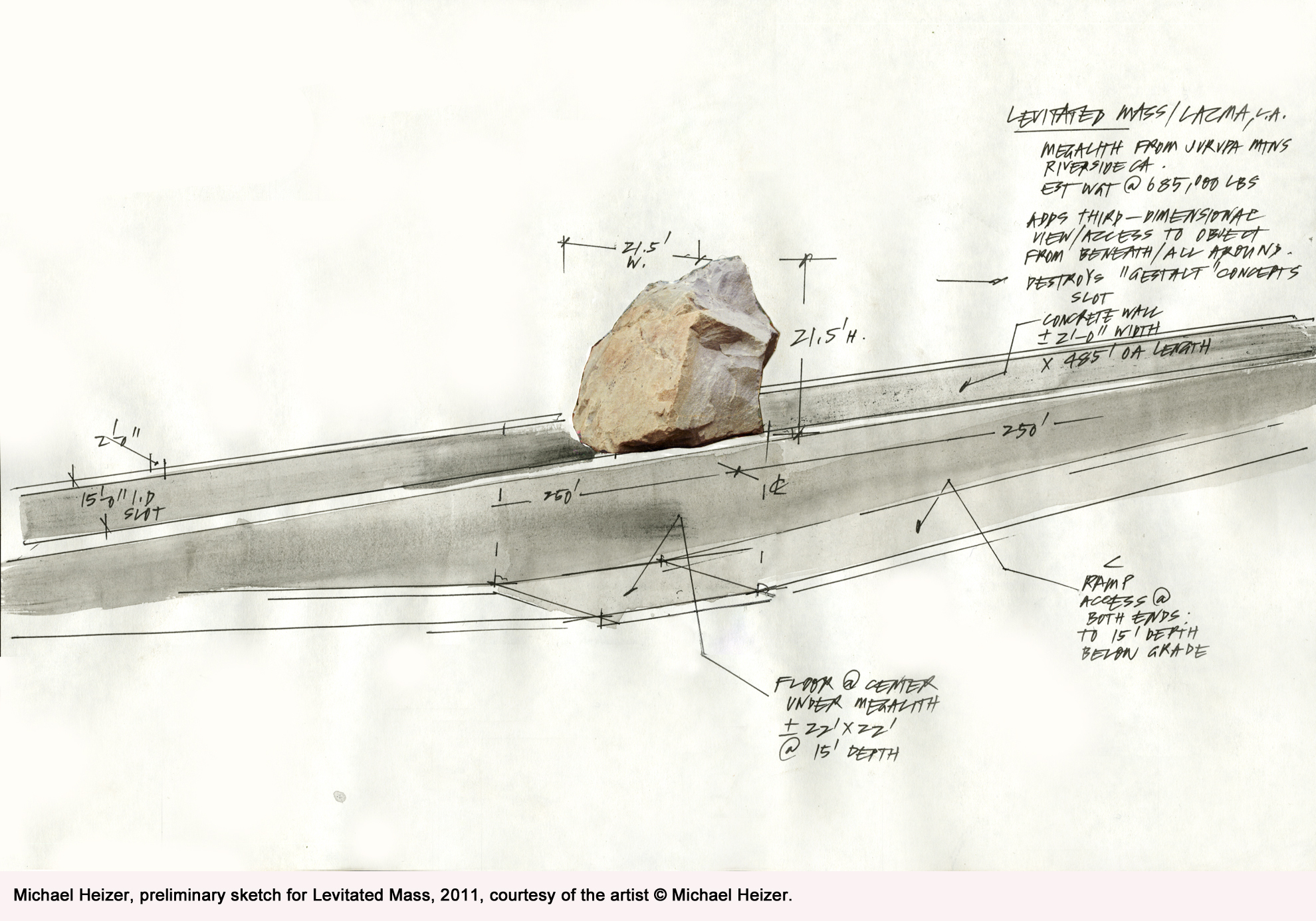 A 2011 sketch by artist Michael Heizer shows the walkway visitors will use to pass under the granite boulder at the center of the Los Angeles County Museum of Art’s installation. (Click here to enlarge.)